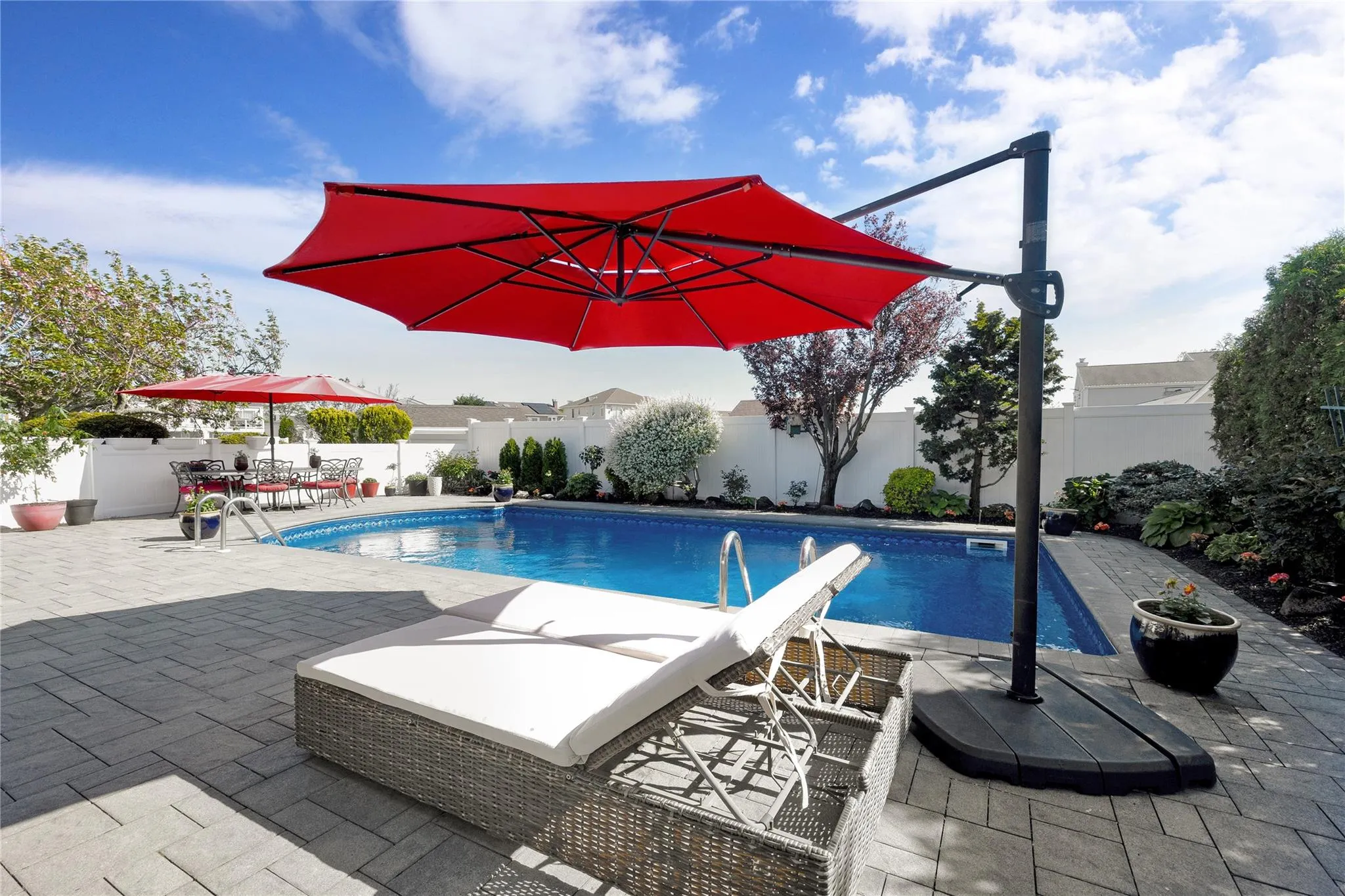 Enjoy resort-style outdoor living with a heated saltwater in-ground pool featuring a brand-new deep blue liner, surrounded by pavers that extend through the pool area and driveway. The professionally landscaped grounds include a lush lawn, rare conifers, vibrant flowers, Japanese Maples, and a private vegetable garden with a large double shed—perfect for the green thumb. A 7-zone sprinkler system keeps the grounds looking pristine, and security cameras around the exterior offer peace of mind.\n