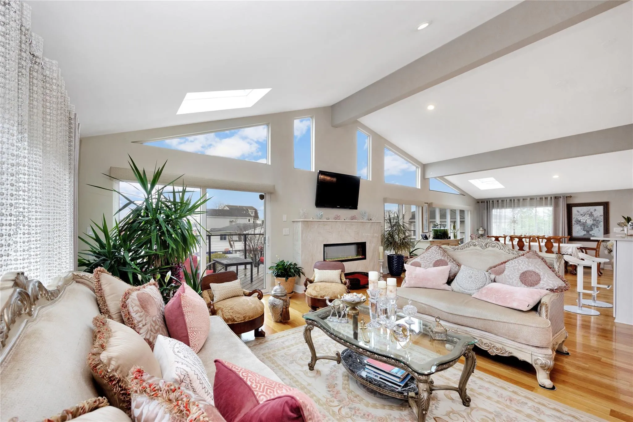 Inside, the top floor offers an open, sun-drenched layout with soaring ceilings, skylights, and floor-to-ceiling windows. A formal living room with a built-in fireplace flows seamlessly to a massive new deck with sweeping water views—an entertainer’s dream. The updated kitchen features modern appliances, a large island, and generous prep space.\n