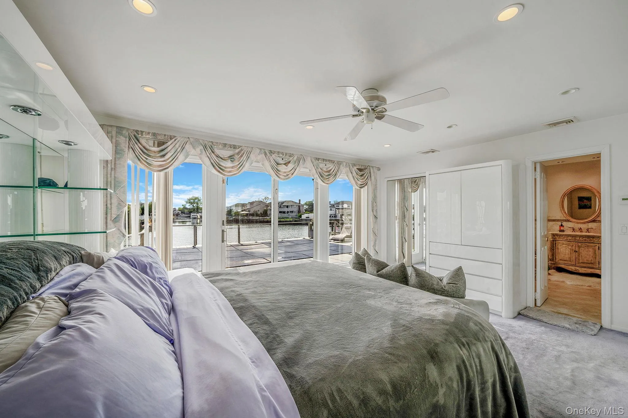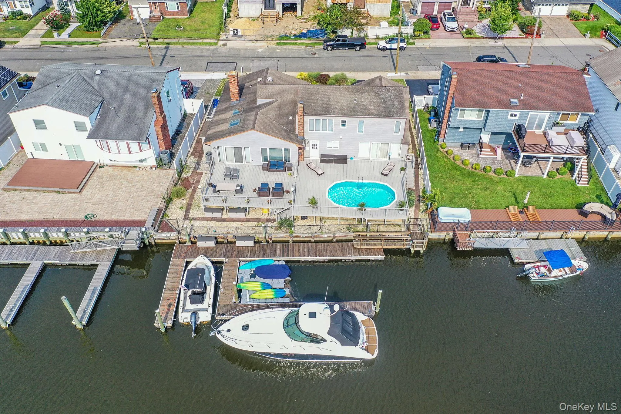 Live the dream on this rare 80-foot-wide waterfront property! A true boater’s paradise! Located on a deep, wide canal, this expanded 4 bedroom, 2 bath expanded ranch offers breathtaking, unobstructed water views from nearly every angle of its sprawling 2,842 square feet of contemporary living space. Step inside to an open concept layout featuring a spacious eat-in kitchen and sunlit family room, beautifully anchored by a dramatic floor-to-vaulted-ceiling 3-sided stone fireplace. Sliders lead to a generous deck with a pool, perfect for entertaining against the stunning waterfront backdrop. Wake up every day to glorious main-level water views from your master suite, complete with private deck access. Enjoy the spa-like bathroom that includes an amazingly large soaking tub and separate shower. Outdoors, the 80-foot frontage truly shines with boat slips and a massive floating dock. The current owner houses 2 – 22ft boats, a 40 ft boat and a few jet skis…bring your super sized boat! Additional highlights include a heated garage, manicured landscaping, circular driveway, and more. Don’t miss this rare opportunity to own 80 feet of pristine waterfront living, an exceptional lifestyle for boaters, entertainers, and anyone who appreciates panoramic views and luxury comfort.