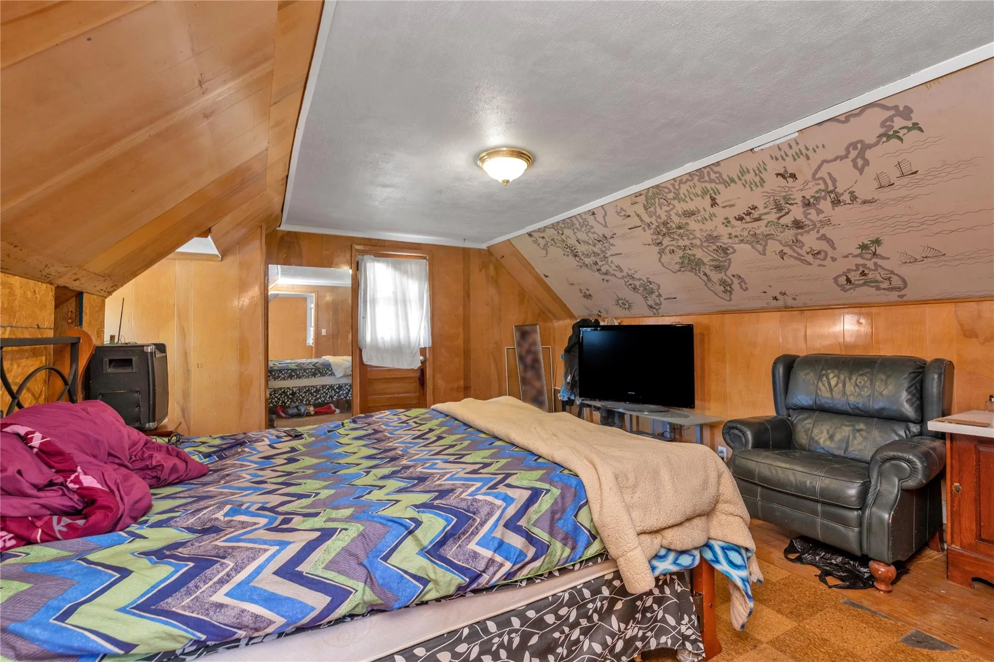 "LongDescription" => "Bedroom featuring wood walls and lofted ceiling"