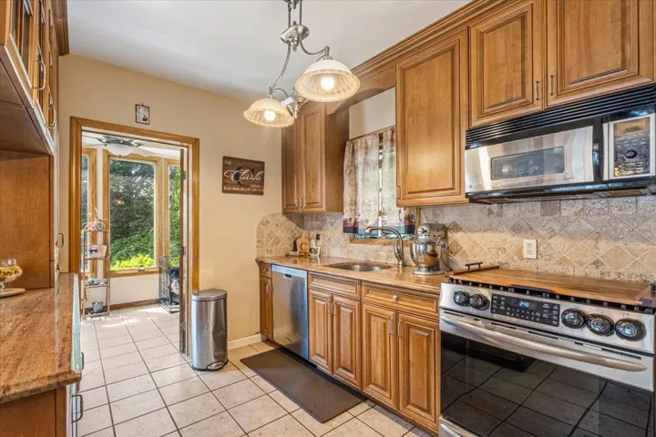 "LongDescription" => "Kitchen with stainless steel appliances, a sink, brown cabinets, backsplash, and hanging light fixtures"