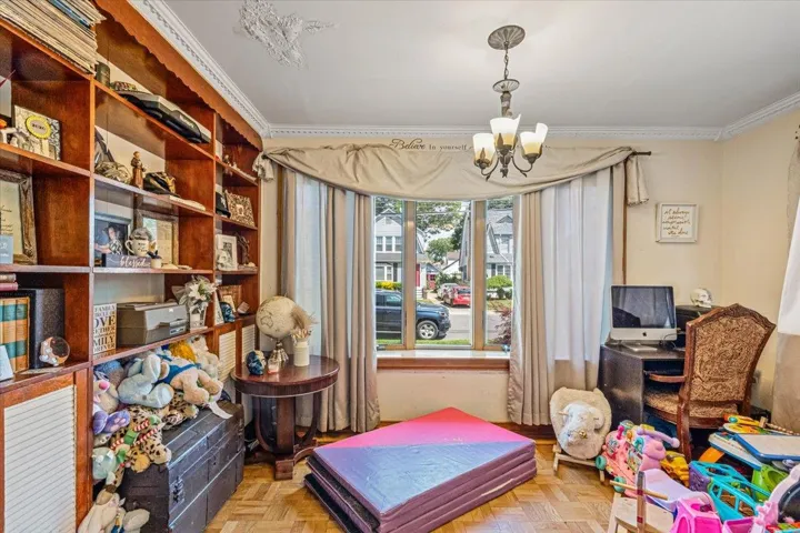 "LongDescription" => "Bedroom with a chandelier, ornamental molding, and an office area"
