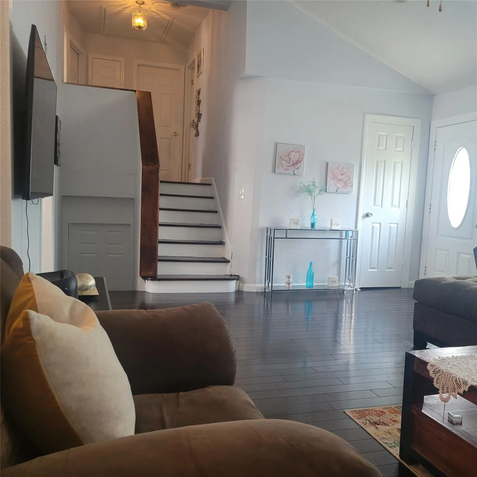 "LongDescription" => "Living area with wood finished floors, vaulted ceiling, and stairs"