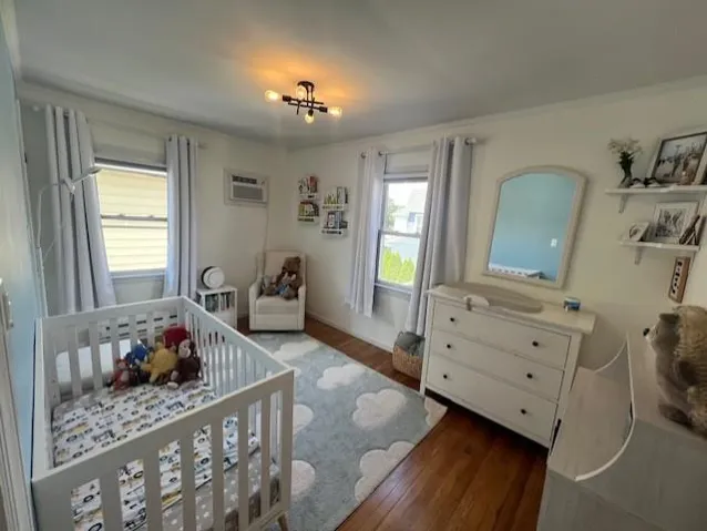 "LongDescription" => "Bedroom featuring hardwood / wood-style floors, a nursery area, ornamental molding, and a wall mounted air conditioner"