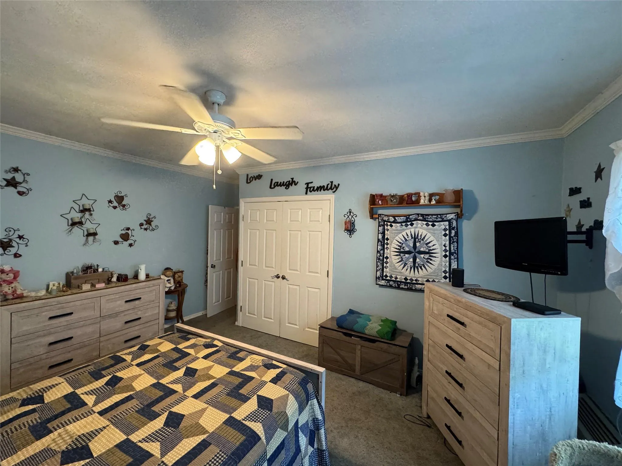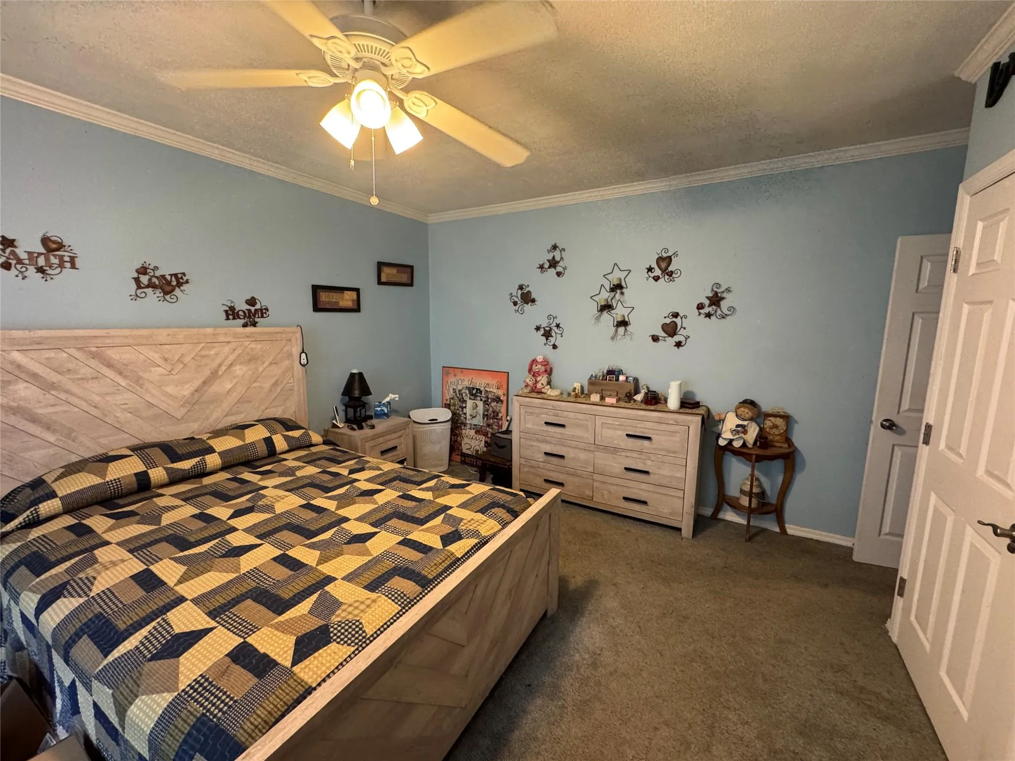 "LongDescription" => "Living area featuring crown molding, arched walkways, carpet flooring, a textured ceiling, and a ceiling fan"