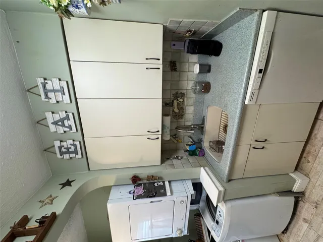"LongDescription" => "Kitchen with a textured ceiling, range, light countertops, white cabinetry, and refrigerator"