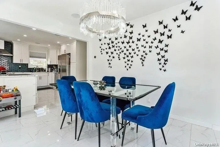 "LongDescription" => "Dining room with light marble finish flooring, recessed lighting, and a chandelier"