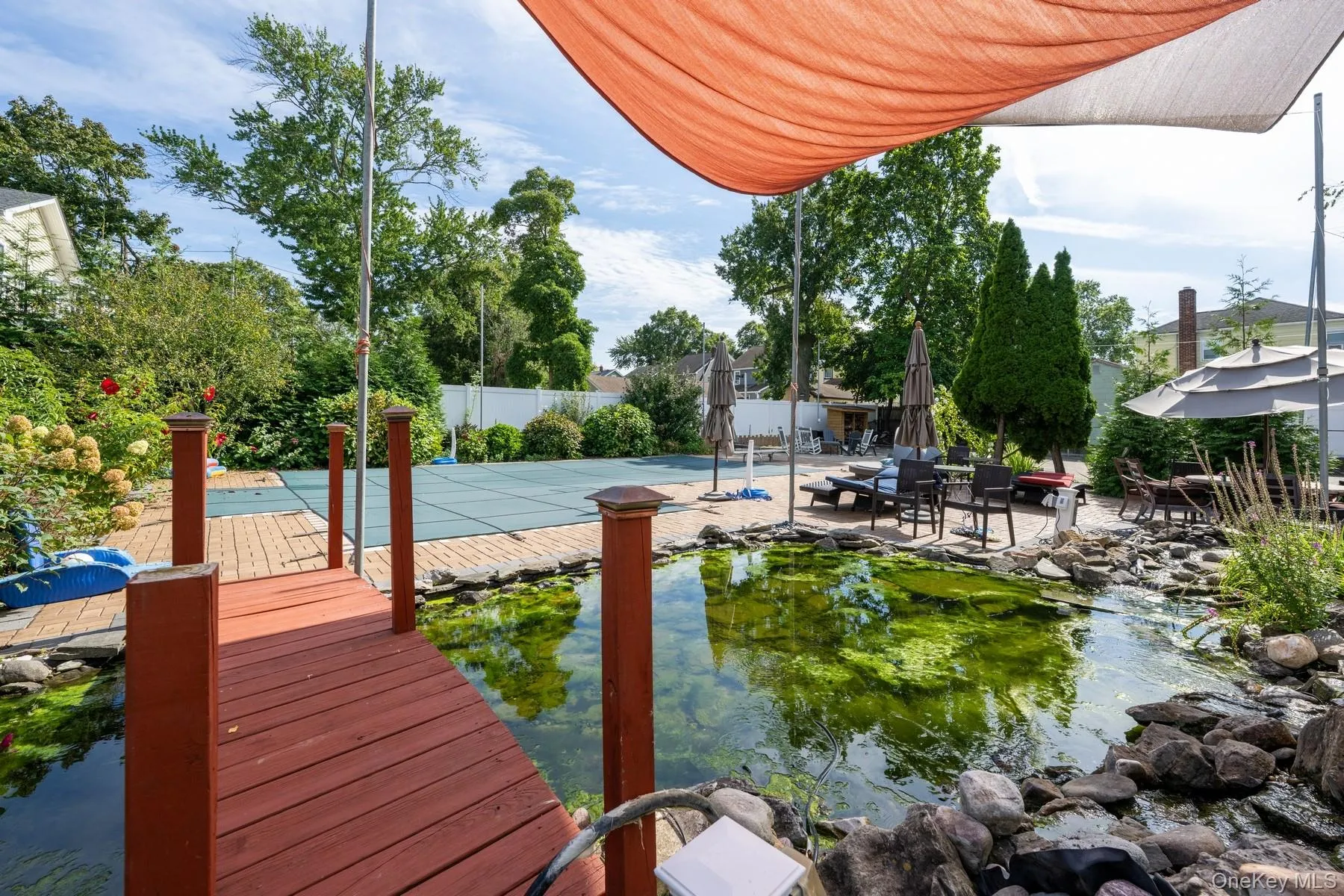 This spacious split-level home features 4 bedrooms, 3 full baths, set on an impressive 72 x 215 lot. Step outside into your own private resort, complete with an inground salt water pool, with new vinyl liner, hot tub spa, and a tranquil koi pond adding a touch of elegance and harmony to the landscape, beautiful mature gardens, endless stone patio, built-in fire pit and a wood deck, a bonus: the inground sprinkler system is supplied by your private well, allowing you to water the entire property with ease and no cost.