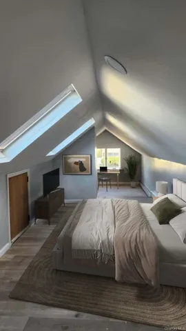 "LongDescription" => "Virtually staged to showcase potential layout and design. Bedroom featuring wood finished floors, a skylight, lofted ceiling, and baseboard heating."