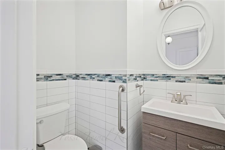 "LongDescription" => "Bathroom with vanity, wainscoting, toilet, and tile walls"