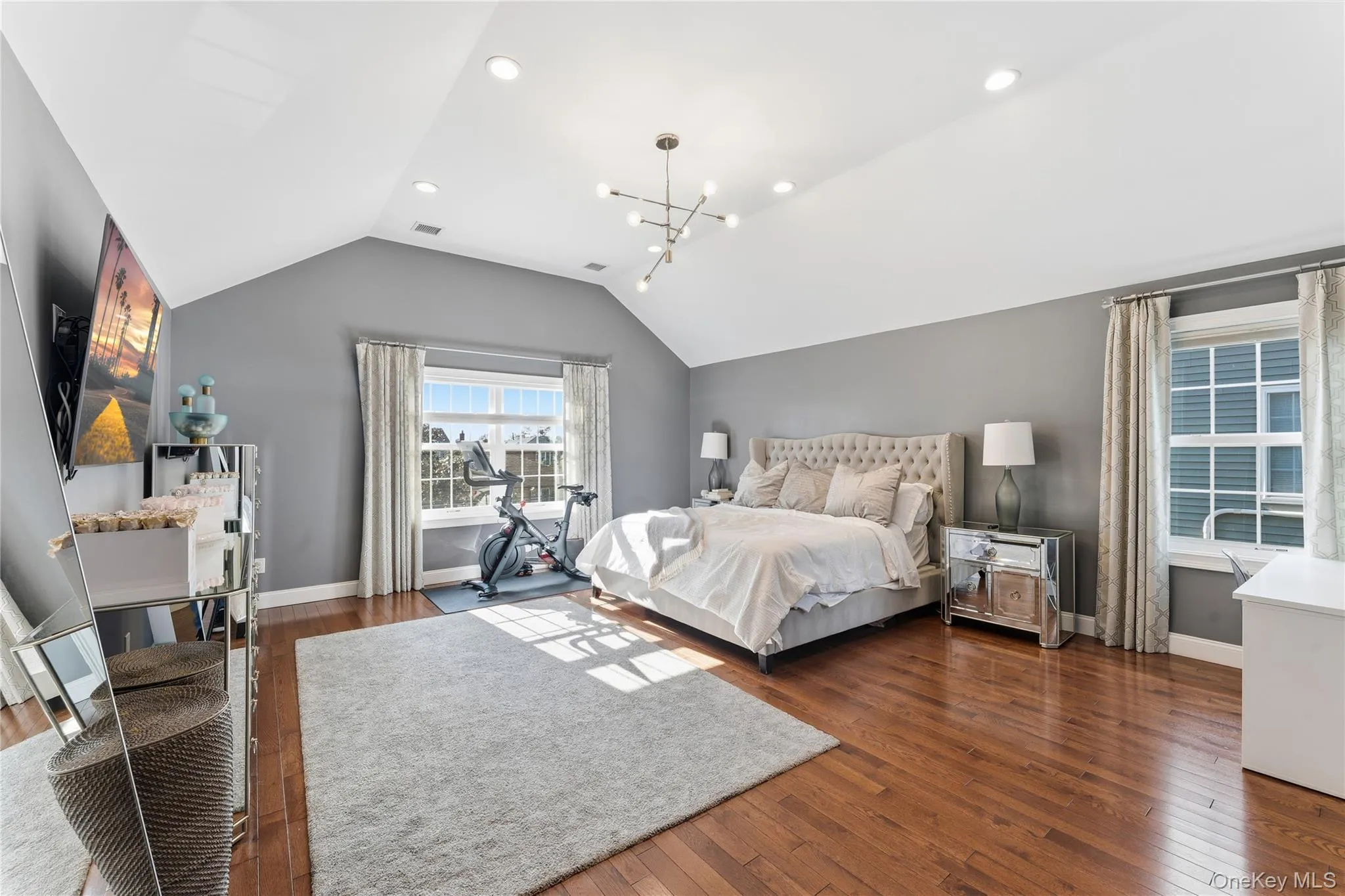 Upstairs, the expansive primary suite awaits. It features a soaring cathedral ceiling, dual custom walk-in closets, and a private en-suite bathroom with a double vanity. Three additional spacious bedrooms, each with ample custom closet space, share a well-appointed full bathroom. A convenient second-floor laundry room makes chores a breeze.