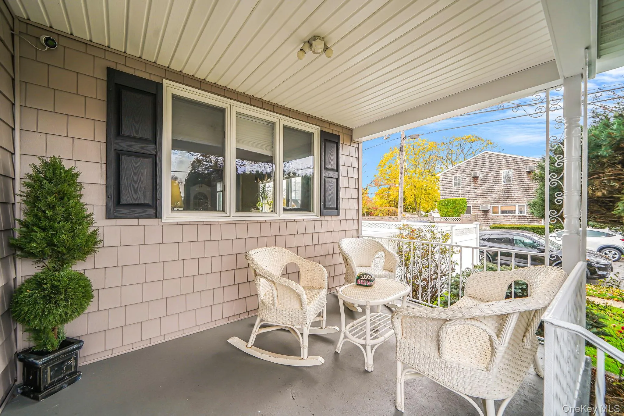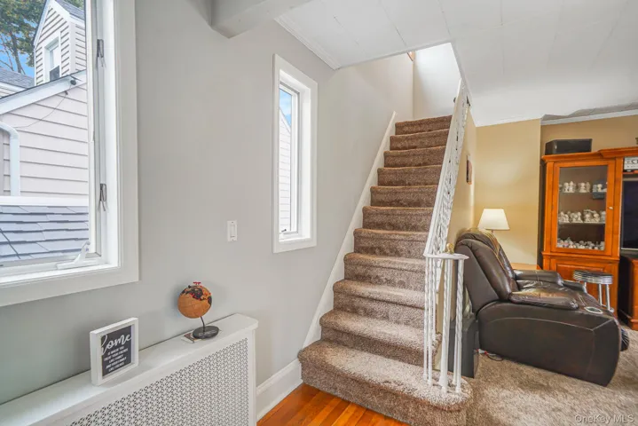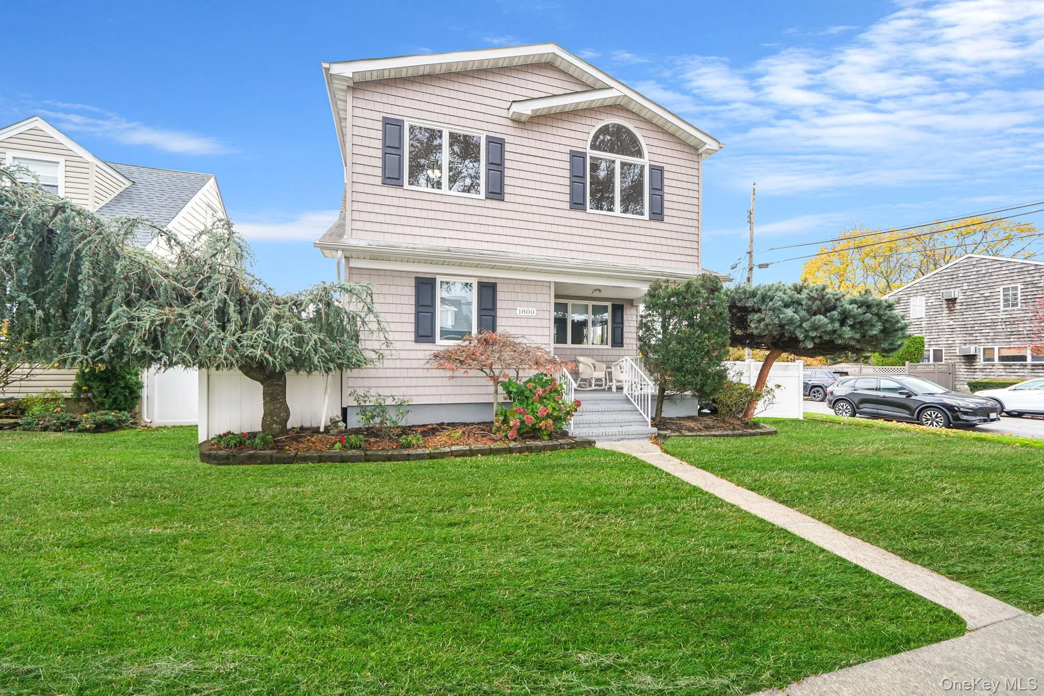 Welcome to this charming expanded cape situated on a professionally landscaped corner lot, where a covered front porch welcomes you into an inviting entry that opens to a spacious living room and staircase leading to the second floor. The first floor features an updated kitchen with access to the backyard, a formal dining room perfect for entertaining, and a convenient half bathroom, while the dormered second floor offers three generously-sized bedrooms including a large master bedroom and an updated full bathroom. Step outside to discover a large sized deck ideal for outdoor entertaining and relaxation in your private backyard oasis with a 4 zone wi-fi enabled in ground sprinkler system. Hardwood floors throughout the first floor. The house is equipped with a Nest thermostat for the oil heating system. Natural gas is also connected to the house which supplies the stove and dryer. Additional highlights include a full unfinished basement with utility and laundry area plus exterior side entrance, offering excellent storage and potential for future expansion. With modern updates throughout, low-maintenance outdoor living spaces, thoughtful dormered design that maximizes living space, and a well-planned layout, this move-in ready home perfectly blends classic cape charm with contemporary convenience.