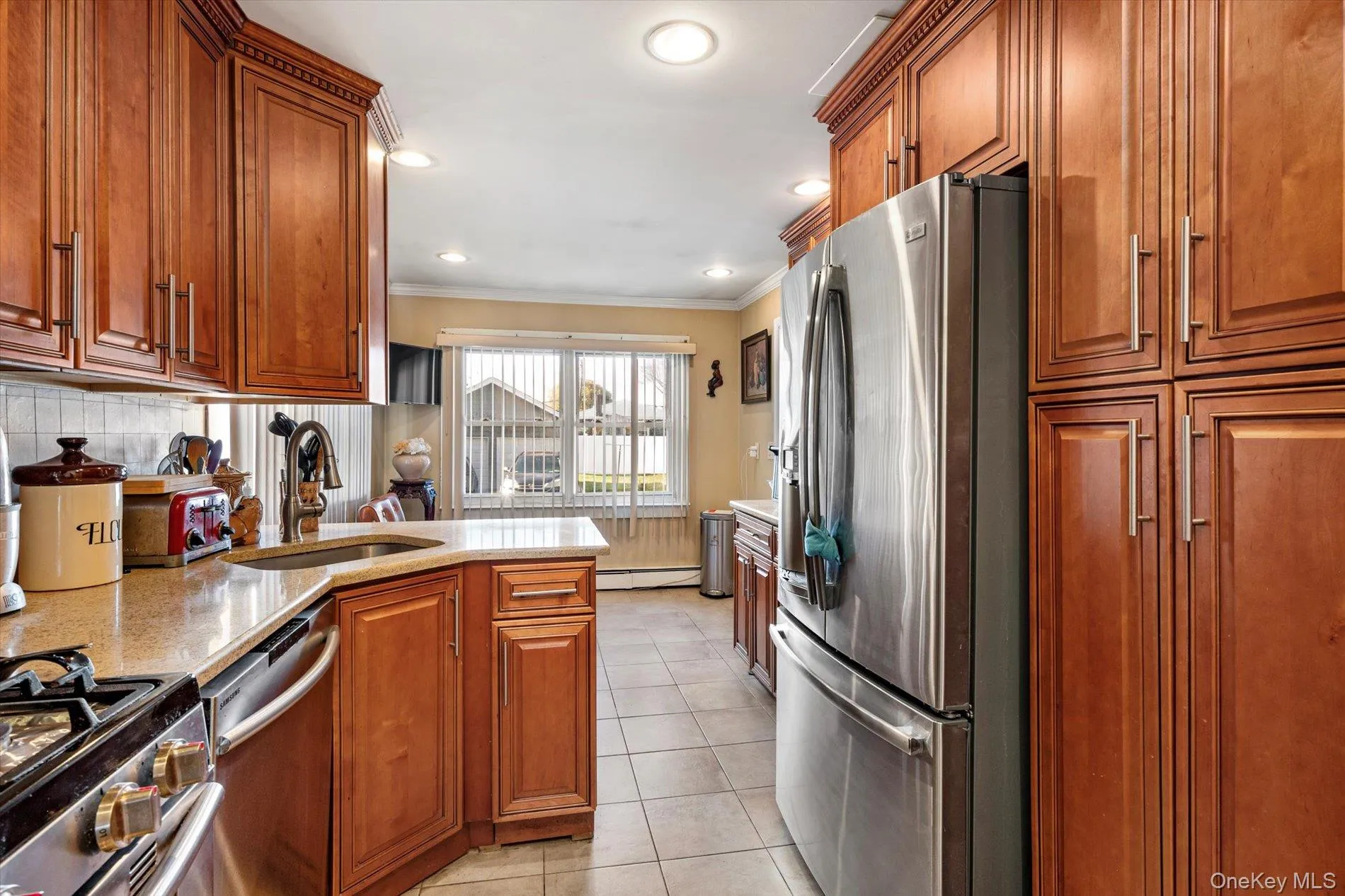 "LongDescription" => "Kitchen with stainless steel appliances, brown cabinets, light stone counters, light tile patterned flooring, and crown molding"