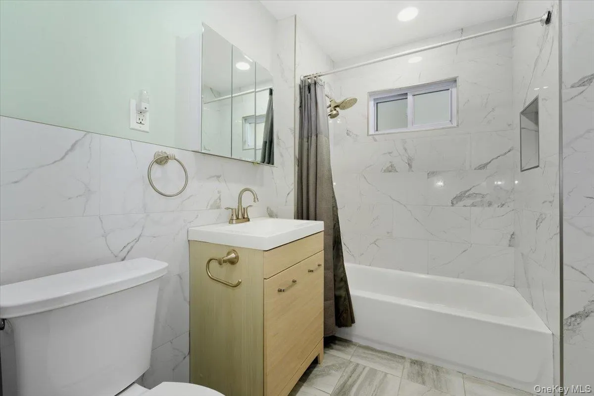 "LongDescription" => "Bathroom with a stall shower, vanity, tile walls, and light tile patterned floors"