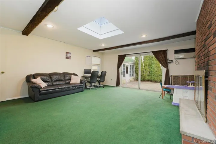 "LongDescription" => "Carpeted living room with a desk, a skylight, beamed ceiling, recessed lighting, and a wall mounted air conditioner"