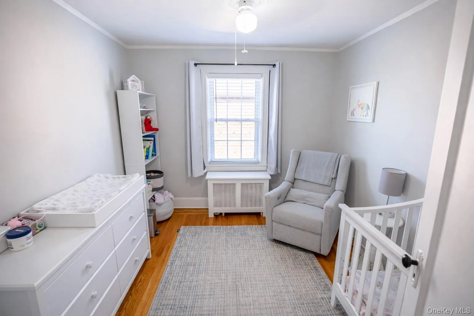 "LongDescription" => "Bedroom with a nursery area, radiator, light wood-style floors, ornamental molding, and ceiling fan"
