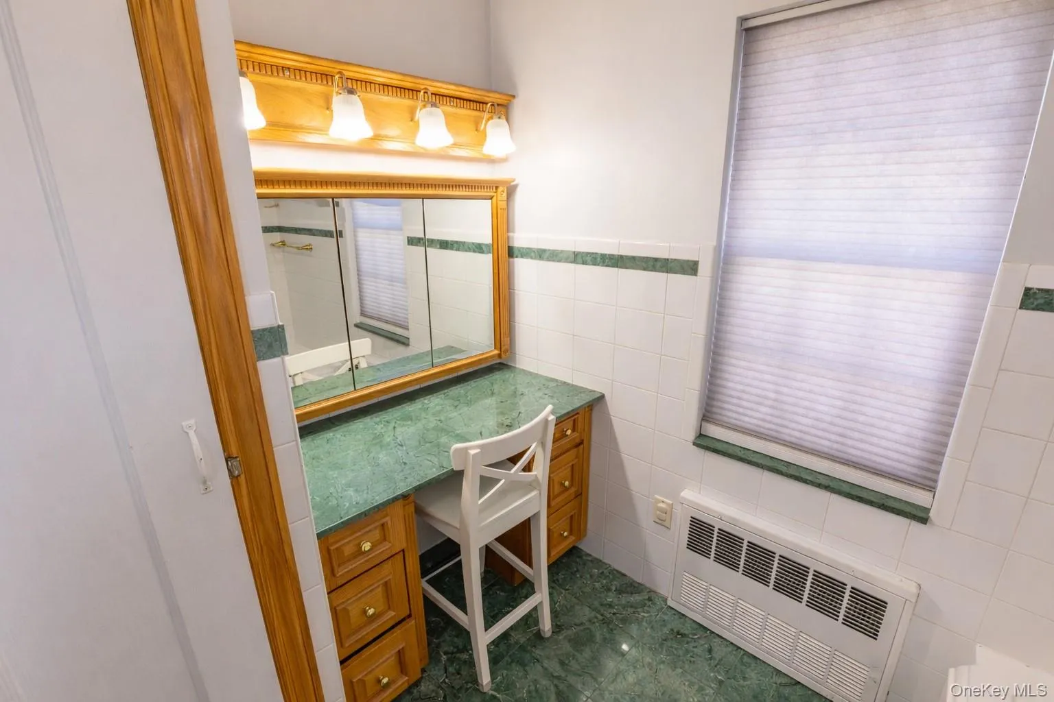 "LongDescription" => "Bathroom with tile walls, radiator, wainscoting, and vanity"