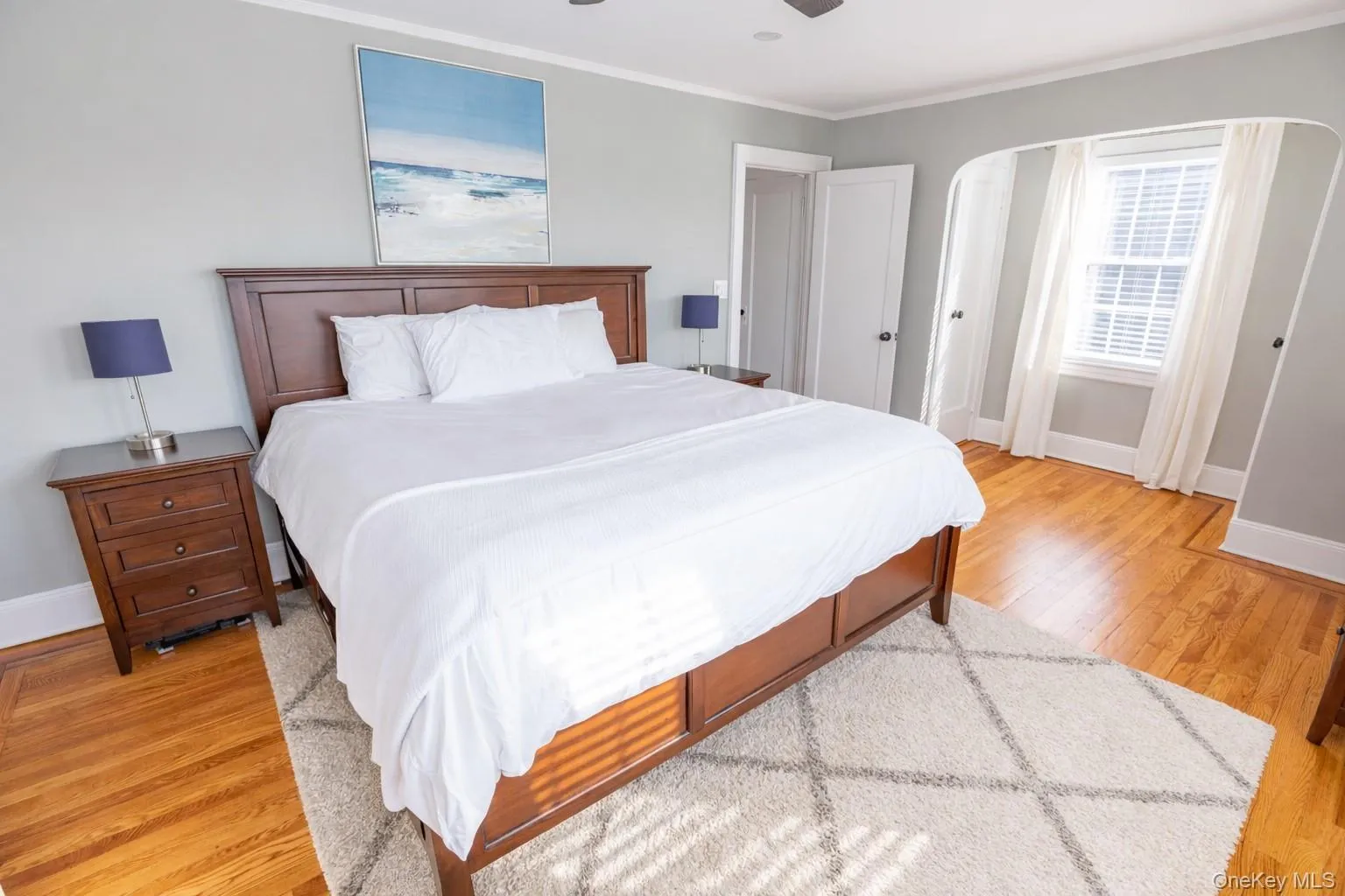 "LongDescription" => "Bedroom with radiator heating unit, light wood-type flooring, a ceiling fan, ornamental molding, and multiple windows"