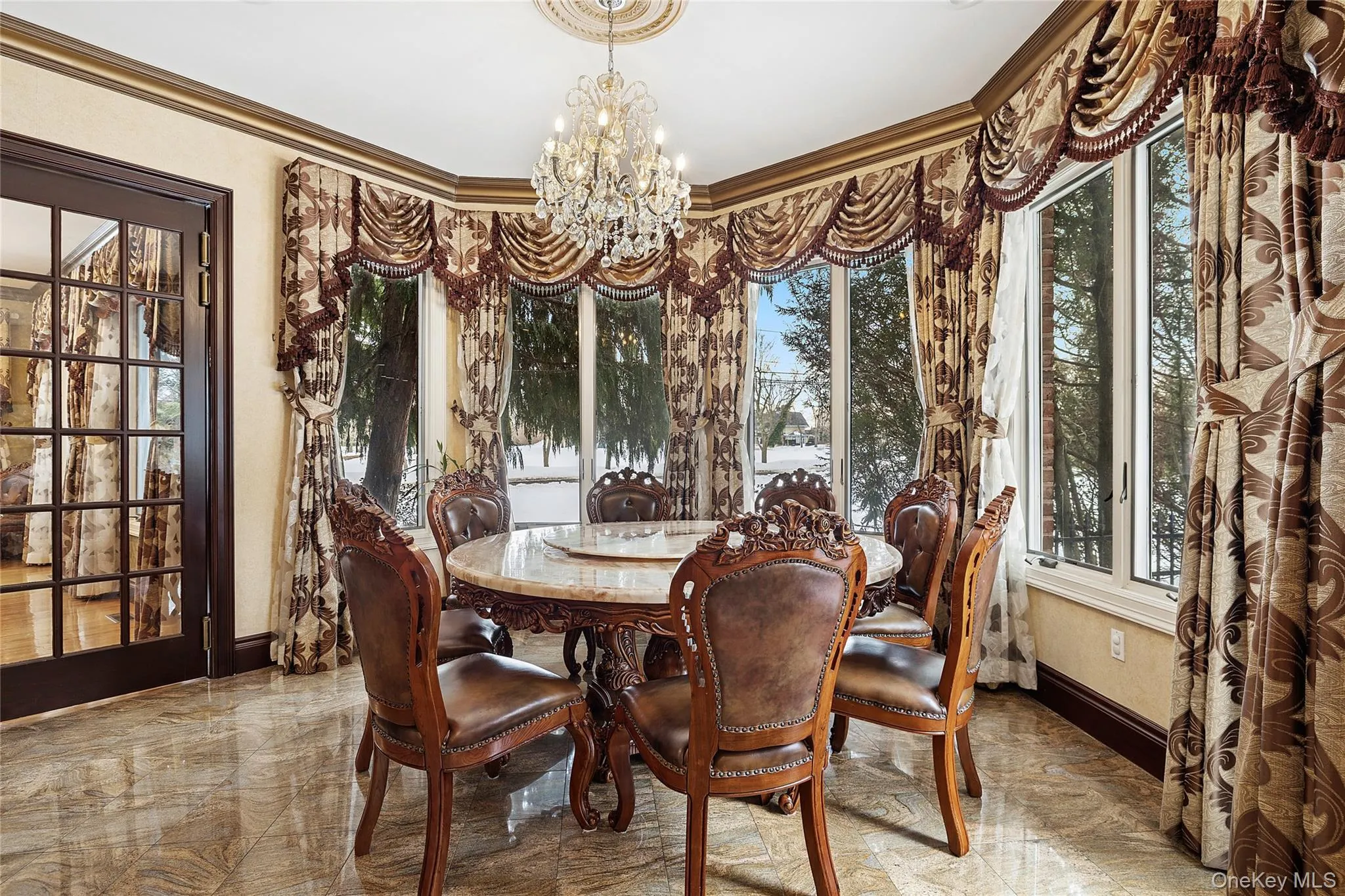 The sumptuous primary suite serves as a tranquil private sanctuary. The primary en suite bath offers a serene retreat, featuring marble floors and walls, a deep soaking tub, a separate glass-enclosed shower, dual vanities, a private toilet room, and an adjoining Grand Dressing Suite.