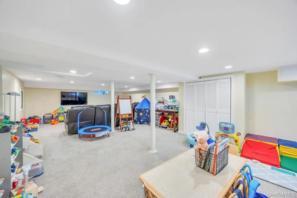 The fully finished basement elevates the living experience with a stylish recreation space and play area.