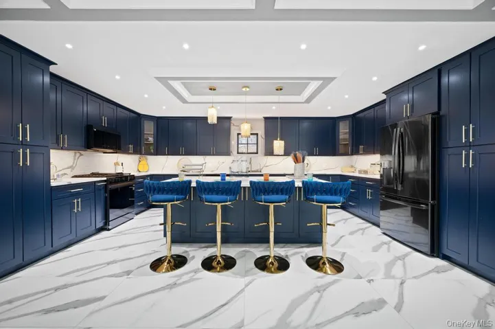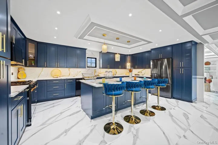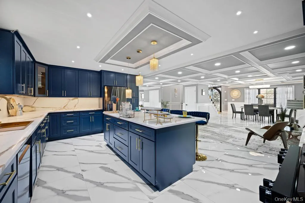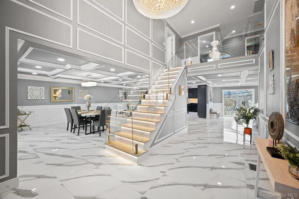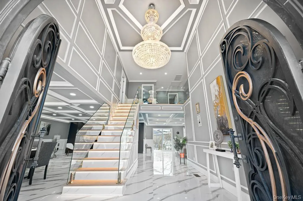 The home’s impressive curb appeal includes meticulous landscaping, a wide paver driveway for up to eight vehicles, and a striking 20-foot entry door. Inside, the grand foyer dazzles with a sleek open-concept layout highlighted by a stunning chandelier and porcelain heated tile floors. At the heart of the home is an expansive chef’s kitchen with top-tier appliances, perfect for casual meals or entertaining.