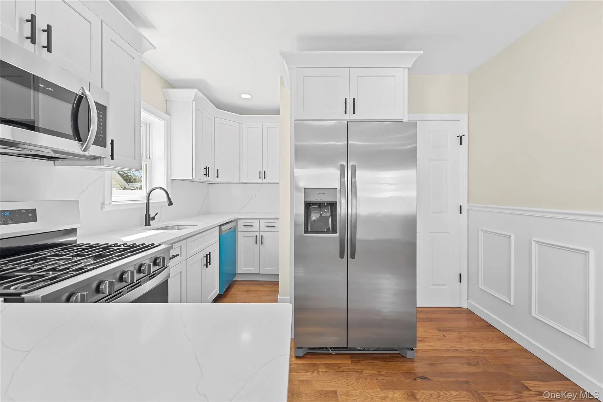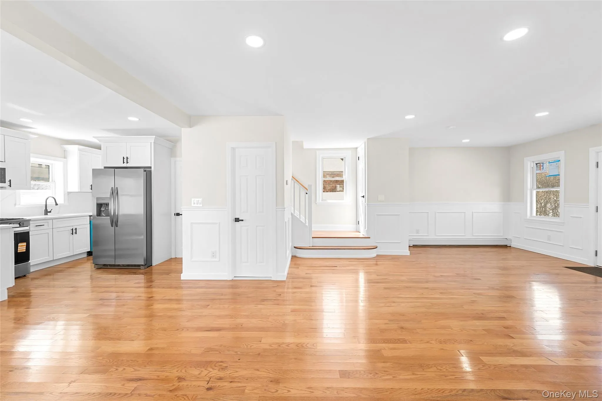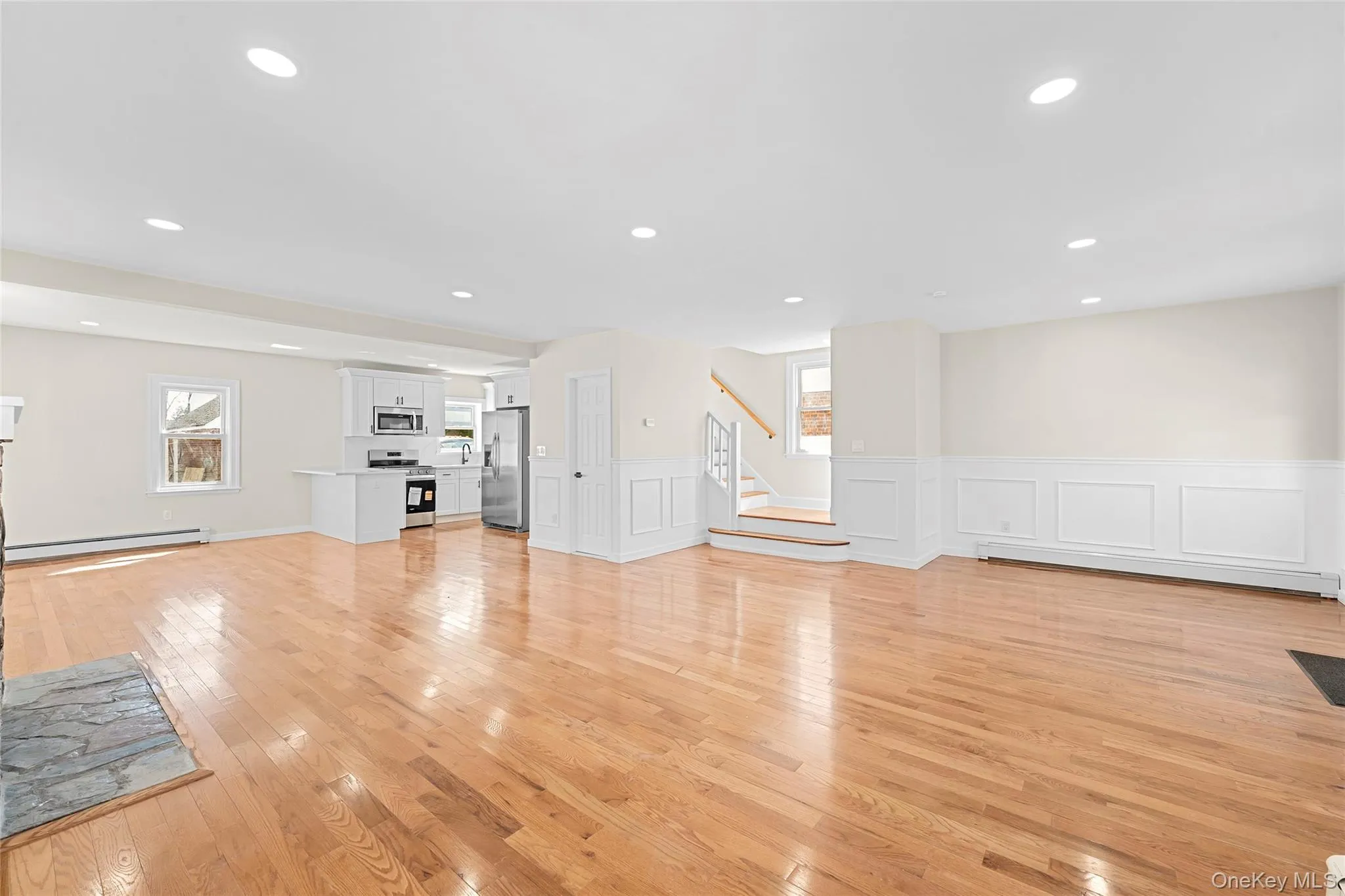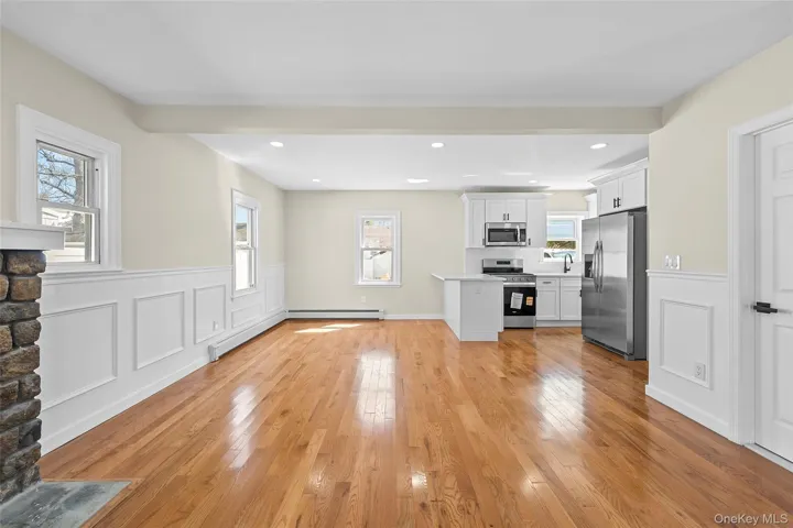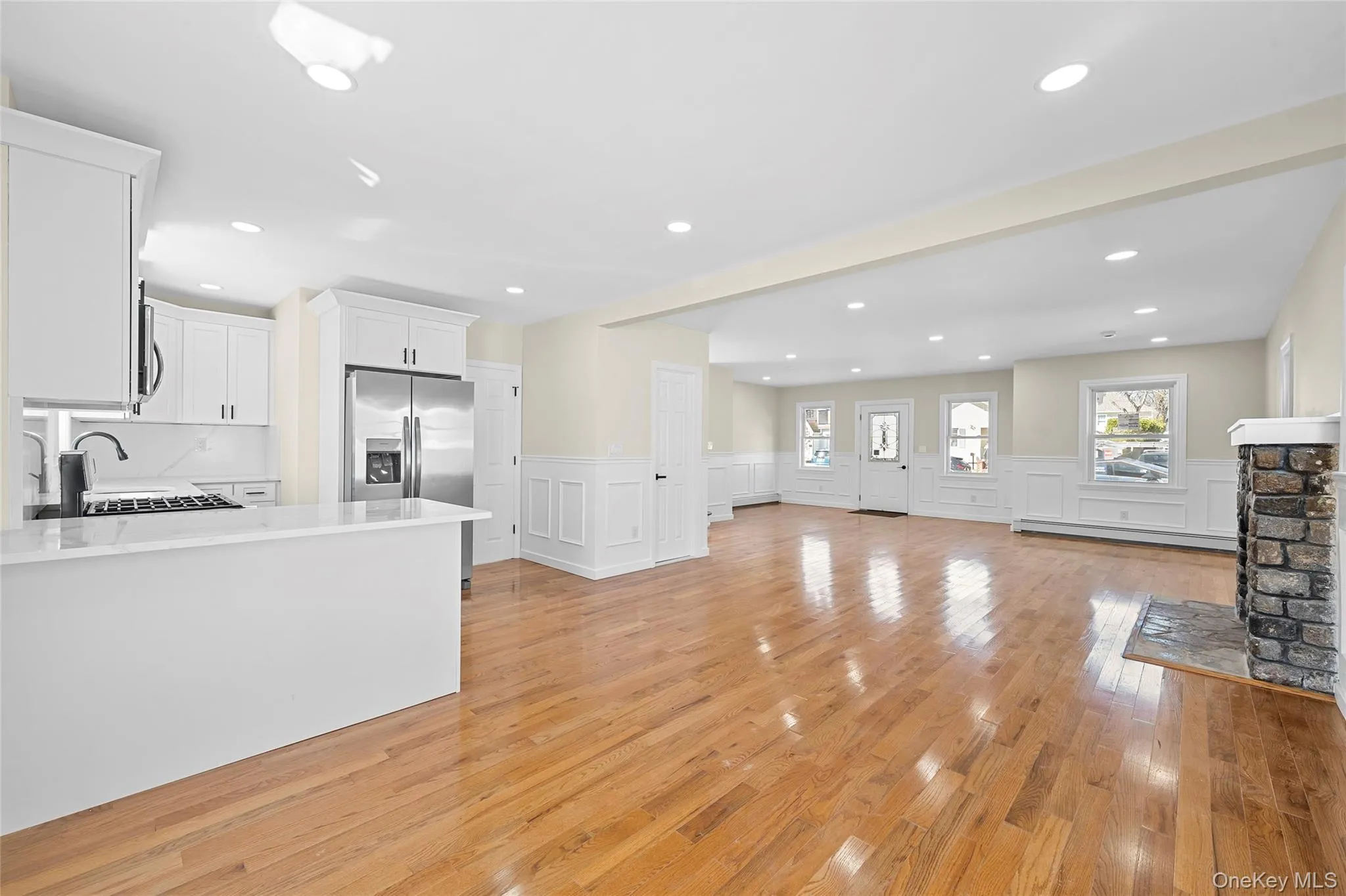 The main level features a bright open-concept layout with gleaming hardwood floors, recessed lighting, elegant wainscoting, and a spacious living and dining area centered around a charming fireplace. The fully updated kitchen is designed for both style and functionality, showcasing white shaker cabinetry, stainless steel appliances, sleek countertops, and excellent prep space for everyday living and entertaining.\n