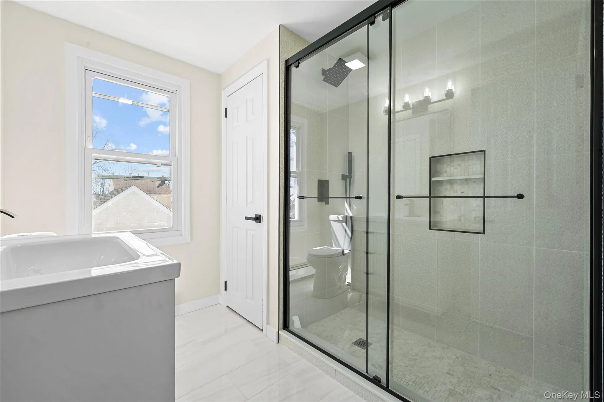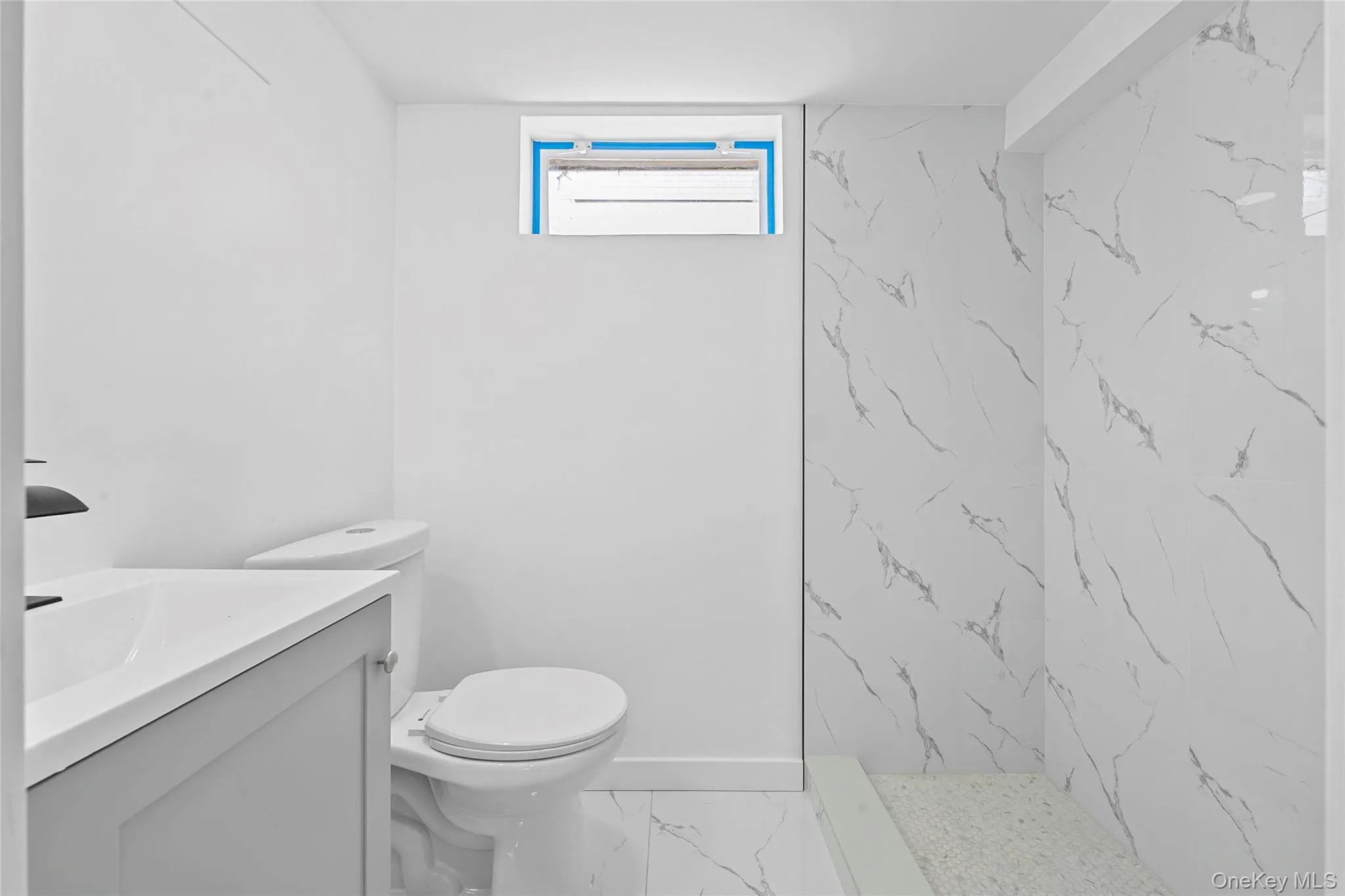 "LongDescription" => "Bathroom featuring vanity, a marble finish shower, and light marble finish floors"