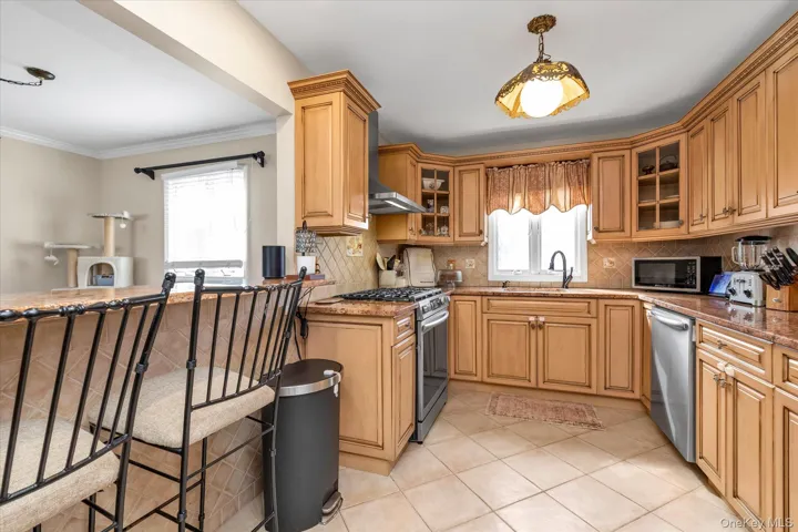 Beautifully Maintained High Ranch on a Quiet Dead-End Street! This spacious home features a sun-filled living room, formal dining room, and an eat-in kitchen with granite countertops and stainless steel appliances. Offering 5 bedrooms and 2 full bathrooms, the home also boasts hardwood floors throughout and elegant moldings. The lower level includes a generous family room with sliders leading to a beautifully fenced backyard—perfect for entertaining—with an above-ground pool and plenty of outdoor space. Additional features include gas heating, a garage, and ample storage. Located in desirable School District #20 and close to transportation, shopping, and more. Potential mother/daughter setup with proper permits.PROPERTY TAXES DO NOT INCLUDE STAR DISCOUNT.