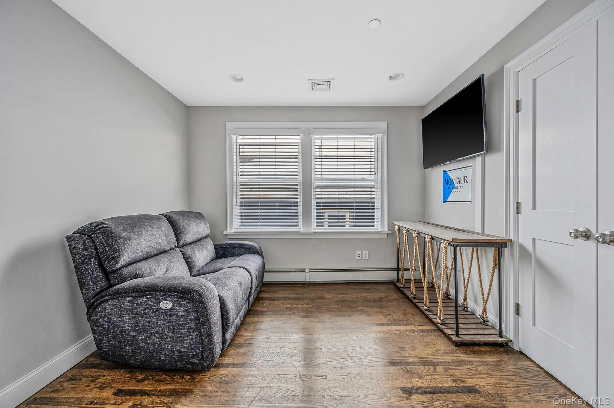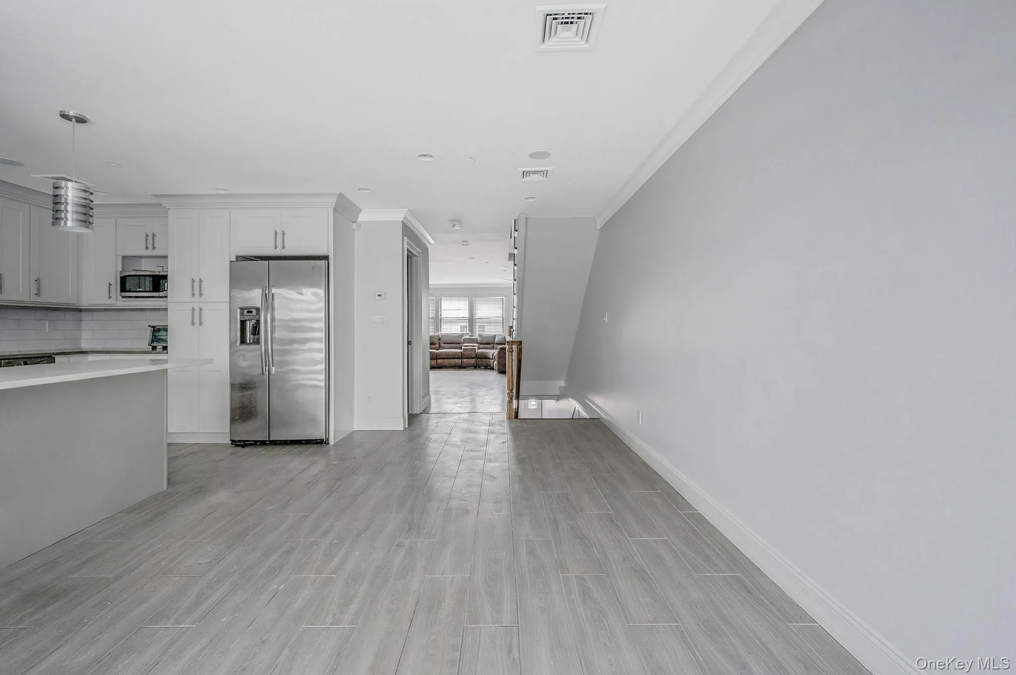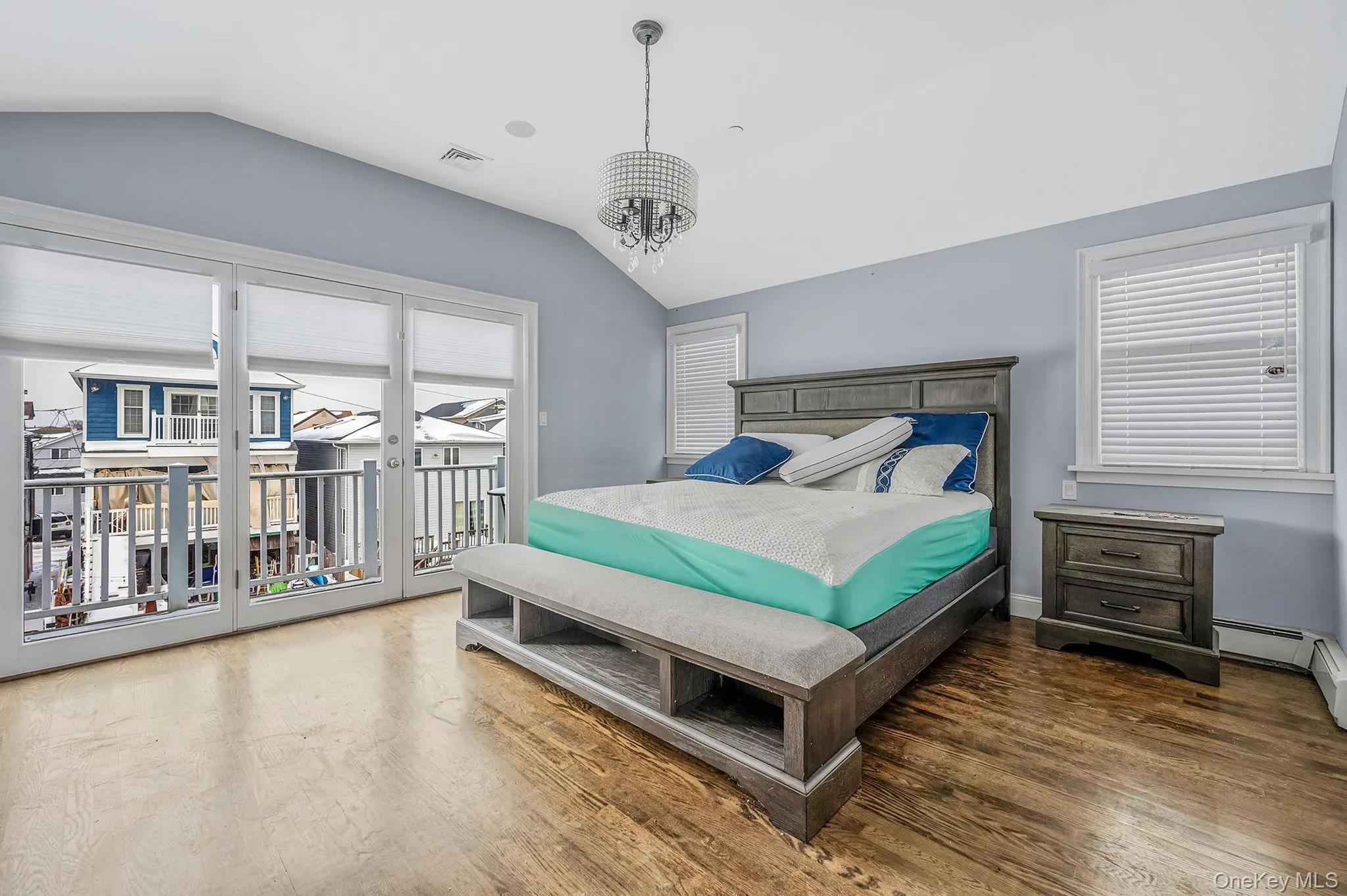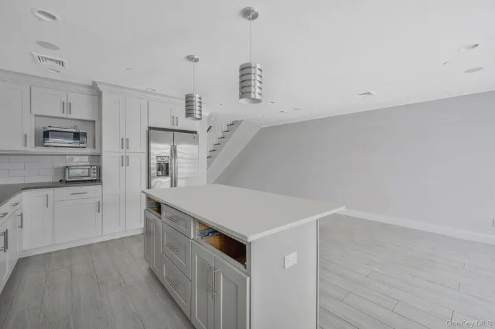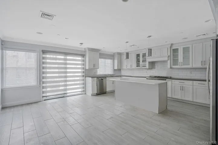 A welcoming foyer leads you upstairs to a sun-drenched main level designed for both everyday living and entertaining. The oversized chef’s kitchen is a showstopper, featuring radiant heated ceramic floors, abundant storage and counter space, a large center island, and a premium Cosmic-brand stove. Expansive sliders with custom blinds open to a deck overlooking the canal, filling the space with natural light and serene water views. Just off the kitchen, the spacious living room continues the airy feel with a gas fireplace and more sunlight pouring in.