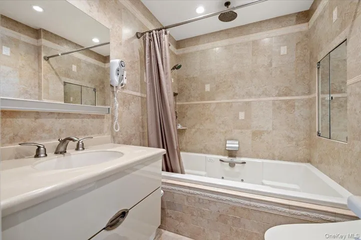 The bedroom quarters include two additional bedrooms and a full bathroom, along with a luxurious primary suite featuring a spa-like bathroom complete with a jacuzzi tub.