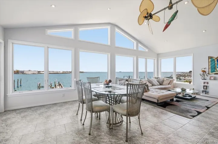 Upstairs, the second level showcases an expansive and sun-drenched living space. A gracious living room, formal dining area, and large open-concept kitchen with breakfast area flow seamlessly into an additional family room. The entire rear of the home is framed by soaring ceilings and dramatic picture windows, capturing breathtaking, unobstructed views of the bay—truly priceless. A private balcony off the kitchen further enhances the experience, offering the perfect setting to enjoy morning coffee or evening sunsets over the water.